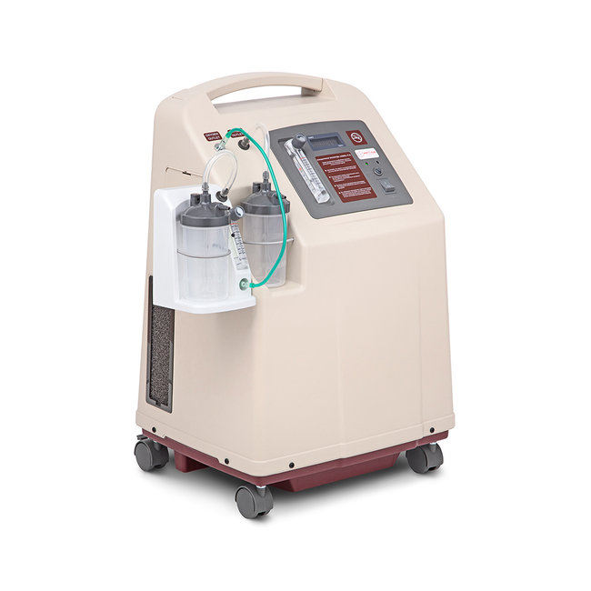 • Аппарат обладает производительностью 5 л/мин и оборудован 2-я выходами для подачи кислородно-воздушной смеси. Концентратор кислорода используется при лечении серьезных заболеваний дыхательных путей, например, таких как ХОБЛ. Два выхода для подачи кислородно-воздушной смеси позволяют подключать два пациента одновременно. Прибор используется преимущественно в медицинских учреждениях, но не исключено применение в домашних условиях. Прибор можно перемещать благодаря маневренным колесам и ручке. Управление максимально простое и интуитивно понятное. Для контроля работы имеется дисплей, на котором отображается скорость потока воздушно-кислородной смеси.