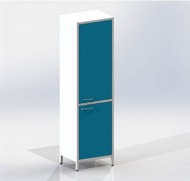 Шкаф одностворчатый на ножках, верхняя и нижняя секция с металлическими дверцами и замками, верхняя секция с двумя металлическими полками, нижняя секция с одной металлической полкой.