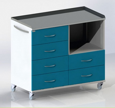 Столик передвижной с выдвижными ящиками, верх из нержавеющей стали, сбоку ручка. Колесные опоры диаметром 50 мм, два колеса с тормозом.