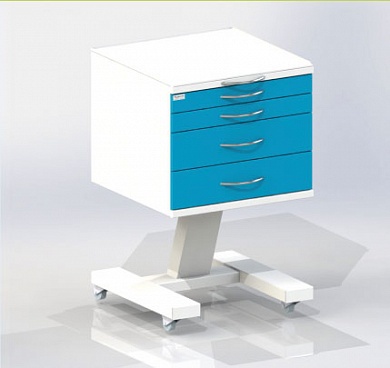 • Подкатная тумба - столик врача с четырьмя выдвижными ящиками, сверху стекло. Колесные опоры на резиновом ходу, две опоры с тормозным устройством.